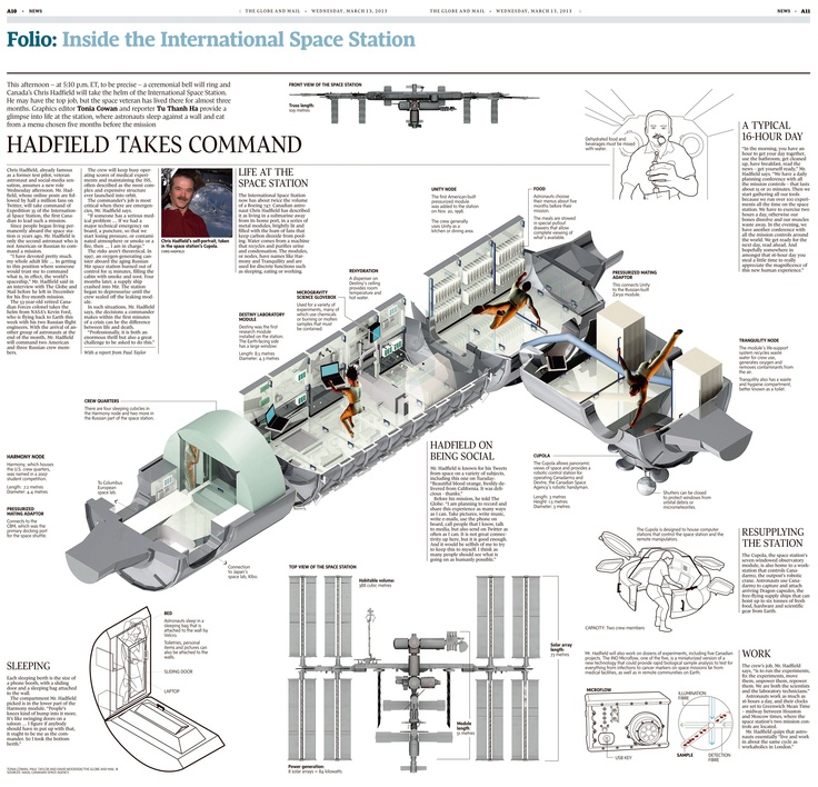 Diagram of a manufacturing innovation, for The Boston GlobePart of an interactive commemorating the Space Shuttle, The Globe and MailInfographic details renovations to the Art Gallery of Ontario, for The Globe and MailLight Pillars Explained, for the Globe and Mail.Interactive series showcasing Canadian innovations, for The Globe and MailInside the International Space Station, based on interviews with Commander Hadfield. For the Globe and MailThe Science of Addiction, for The Globe and MailNEEMO training base. This graphic was part of an interactive that showed the base from all sides. For The Globe and MailMap of ozone levels over the Arctic, and science diagram explaining chlorofluorocarbons. Created for The Globe and Mail in Toronto.